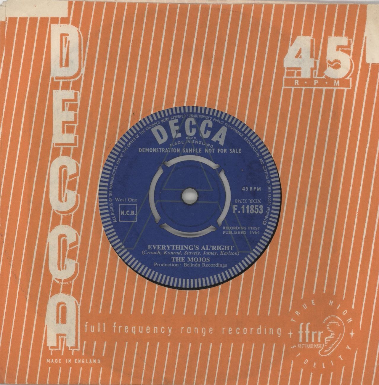 THE MOJOS Everything's Al' Right (1964 UK 'A' Label 7" single with intact four prong centre, also including Give Your Lovin' To Me, Decca company die cut paper sleeve. The vinylhas just a few light surface scuffs to show for it's age. A true bitof 60's beat! F.11853)