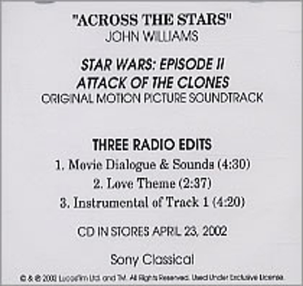John Williams (Composer) Across The Stars US Promo CD-R acetate