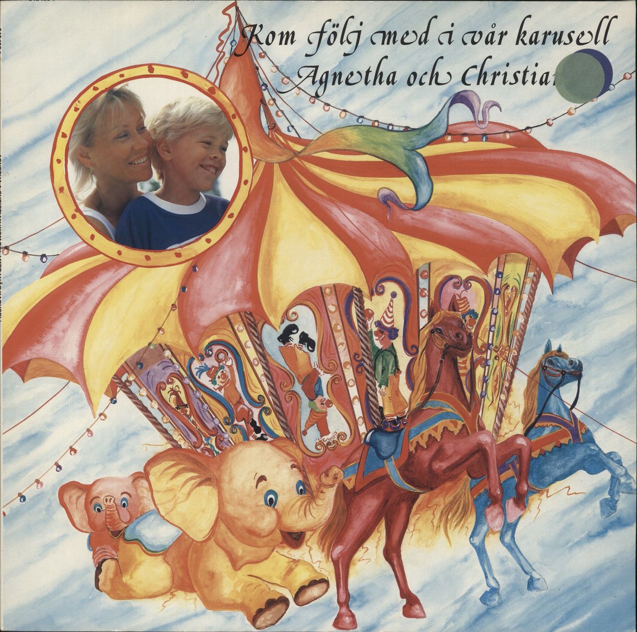 AGNETHA & CHRISTIAN Kom Folj Med I Var Karusell (Rare 1987 Swedish 18-track vinyl LP, a wonderful album of duets, performed with Agnetha's son, housed in a lovely bright and vivid glossy picture sleeve with artwork by the young Christian on the back, complete with lyric inner. The sleeve has a couple of shop stickers to the front and is Near Mint along with the vinyl)