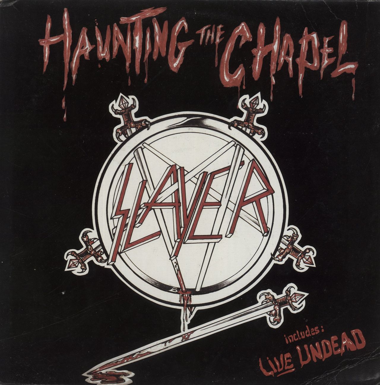 SLAYER Haunting The Chapel EP (1984 Canadian 3-track 12" vinyl EP on the Banzai Records label, including Chemical Warfare & Captor Of Sin, housed a semi glossy card picture sleeve with lyrics on the reverse. The cover displays some minor wearmostly to the edges, whilst the vinyl remains Excellent with only light signs of play)