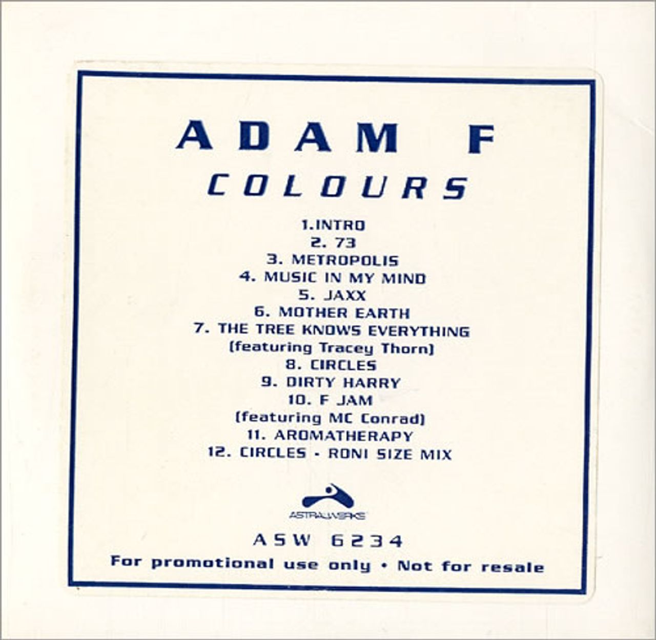 ADAM F Colours (1997 US 12-track promotional including 73, Metropolis & Circles [Roni Size Mix], custom tracklisting stickered sleeve ASW6234)