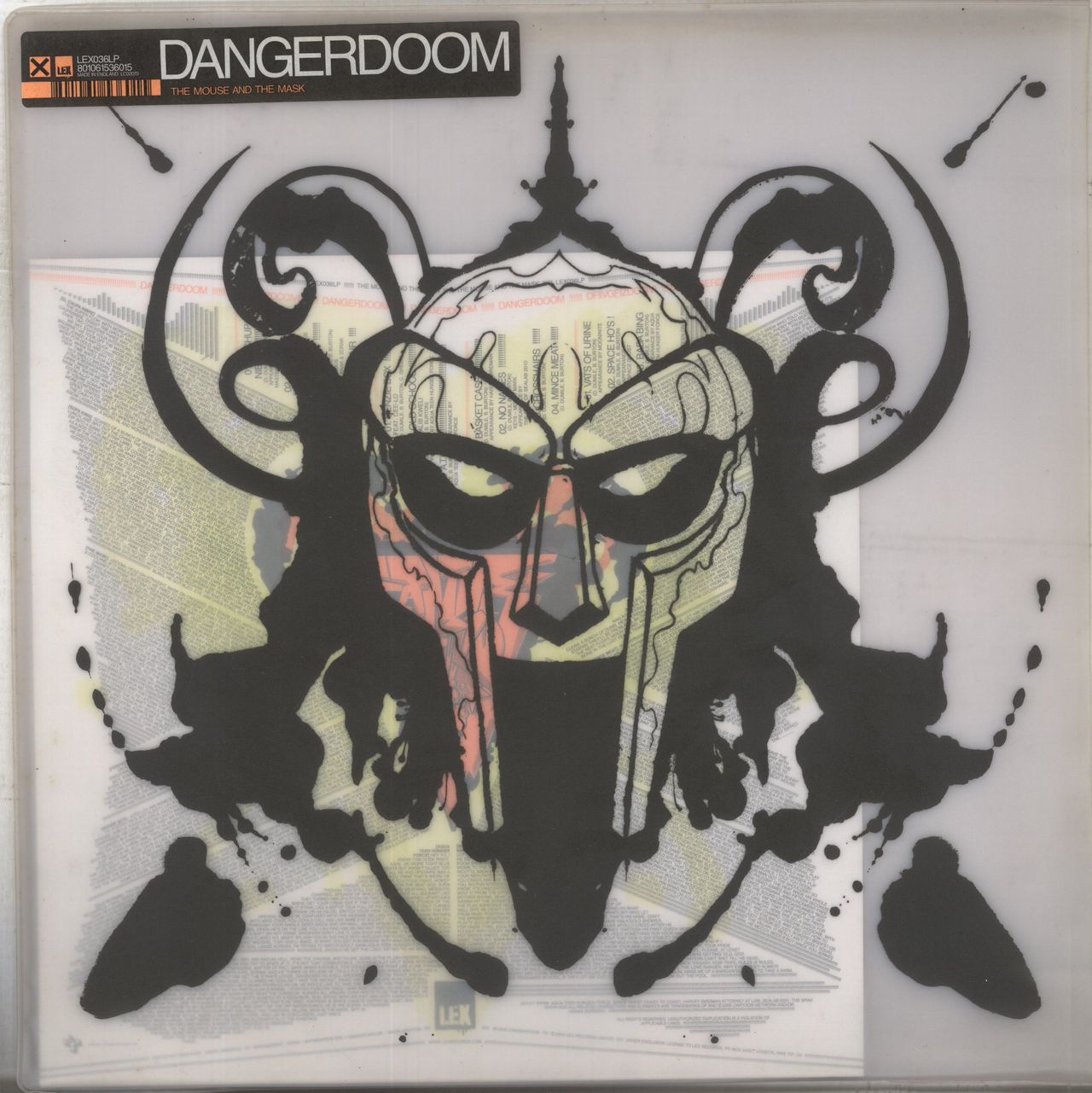 DANGERDOOM The Mouse And The Mask (DANGER MOUSE & MF DOOM) The Mouse And The Mask (Scarce 2005 original UK 14-track double album 2-LP pressed on standard black vinyl, MF Doom's collaboration with Lex super-producer Danger Mouse following Madvilliany and MM.. Food, features Cee-Lo Green of Gnarls Barkley, Talib Kweli, Ghostface Killah, Money Mark and the cast of cult cartoon show Aqua Teen Hunger Force. Each record comes inside its own picture sleeve with 4 colourways to display inside thedeluxe PVC 'Mask & Ears' Outer Art Sleeve. The sleeve shows minor wear with just a small tear at the top of the opening edge with otherwise neglible signs of age-related wear. The vinyl remains in Excellent condition showing minimal signs of wear)