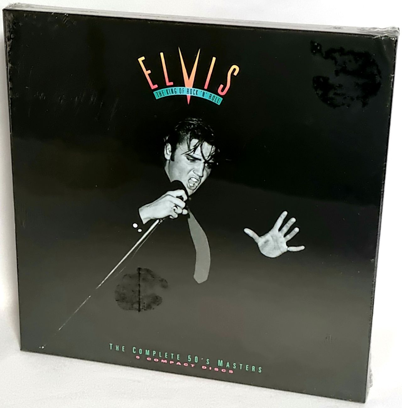 ELVIS PRESLEY The King Of Rock N Roll - The Complete 50's Masters (Sealed 1992 UK/German-pressed limited edition 140-track 5-CD box set, including fourteen previously unreleased performances. Each disc is in its own album jewel case with picture inlay, complete with a deluxe 48-page glossy booklet, Elvis flyer & sheet of unused stickers/stamps, all housed in a 12" square picture box with the large hype sticker on the front. This collector's copy remains factory sealed & unopened, the contents are mint & unplayed PD90689(5))