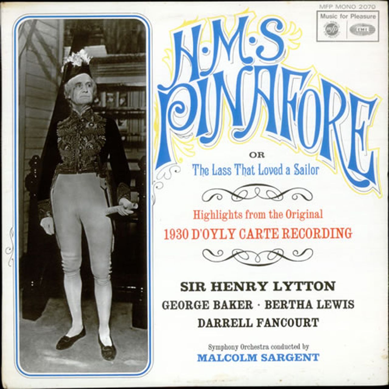 THE D'OYLY CARTE OPERA COMPANY with SYMPHONY ORCHESTRA conducted by MALCOLM SARGENT Highlights From H.M.S Pinafore (1969 UK Mono LP featuring highlights from the original 1930 recording starring Sir Henry Lytton, George Baker, Bertha Lewis andDarrell Fancourt, front laminated flipback picture sleeve. The sleeve shows minimal shelfwear & the vinyl remains in superb condition with few signs of play MFP2070)