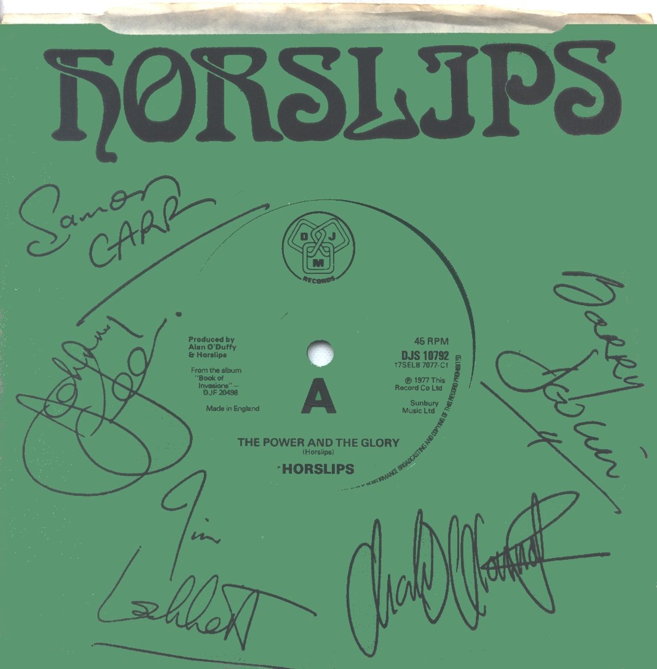 HORSLIPS The Power & The Glory (1977 UK solid centre 7" single pressed on Green Vinyl, also featuring Sir Festus Burke, die-cut paper title sleeve with facsimile autographs of the band DJS10792)