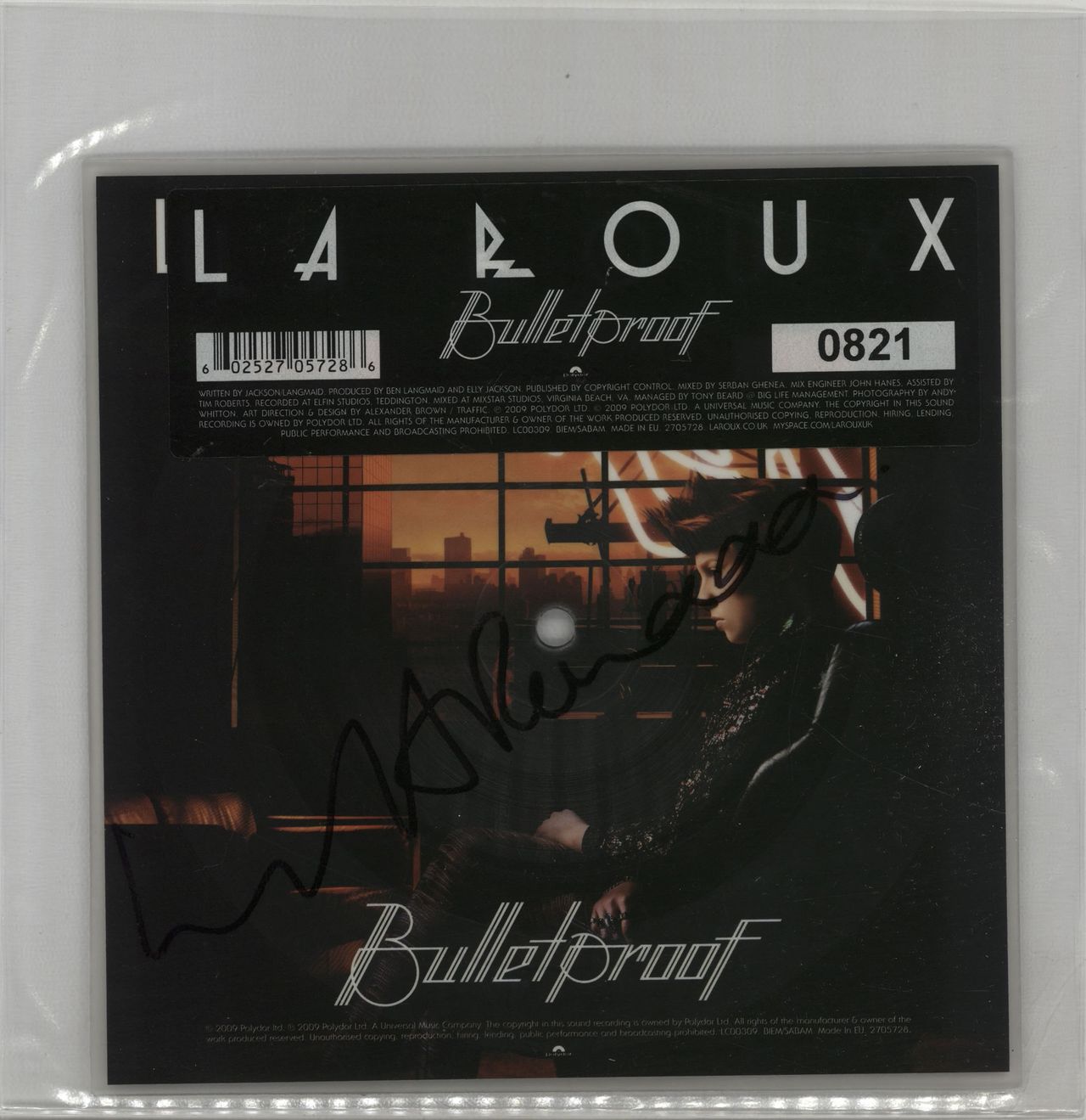 LA ROUX Bulletproof (Rare 2009 UK AUTOGRAPHED limited edition 1-track single-sided 7" SQUARE PICTURE DISC single, housed in an individually numbered & titled stickered clear PVC sleeve. The front of the PVC sleeve has beensigned by La Roux in black marker pen)