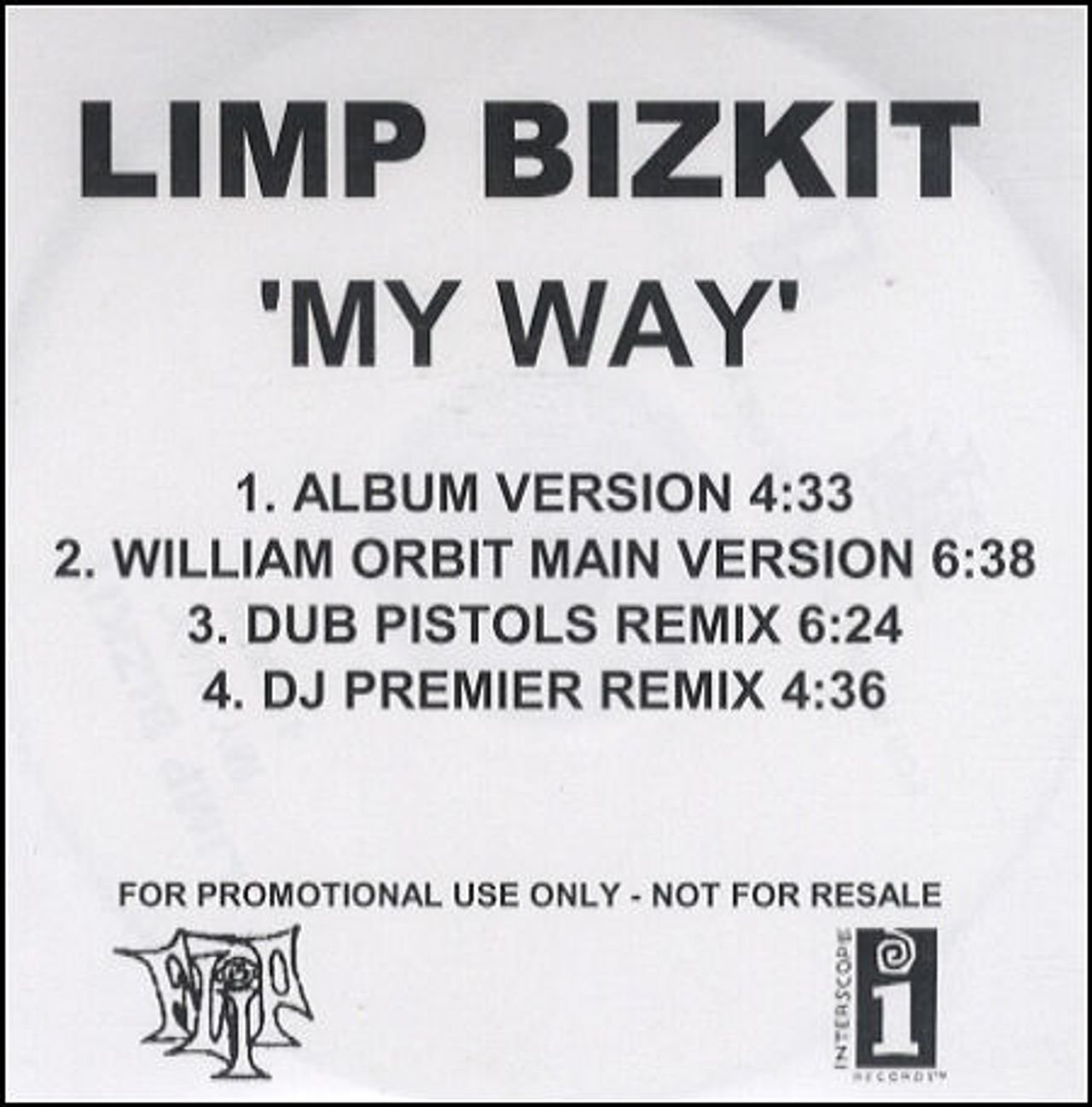 LIMP BIZKIT My Way (Official 2001 UK Flip/Interscope 4-track promotional only CD-R acetate for the single taken from the 'Chocolate Starfish And The Hot Dog Flavored Water' album, includes the Album Version, William Orbit Main Version, Dub Pistols Remix and DJ Premier Remix. Custom printed disc complete with a custom studio title/tracklisting inlay)