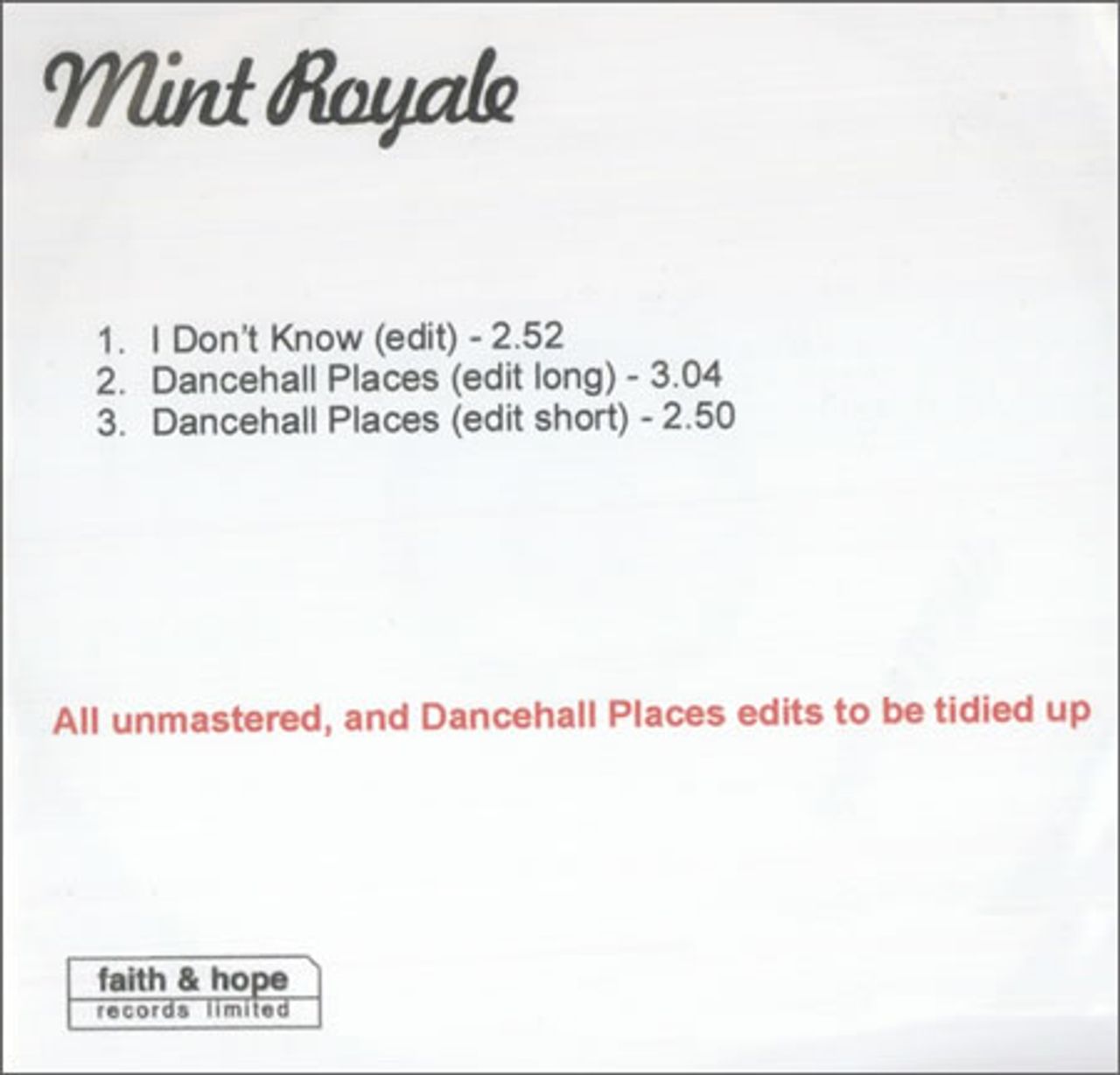 MINT ROYALE I Don't Know (Edit) (2002 UK 3-track advance promotional CD-R for the single release featuring unmastered versions which also includes early provisional Long & Short Edits of Dancehall Places, custom stickered disc & wraparound titleinsert in clear PVC wallet)