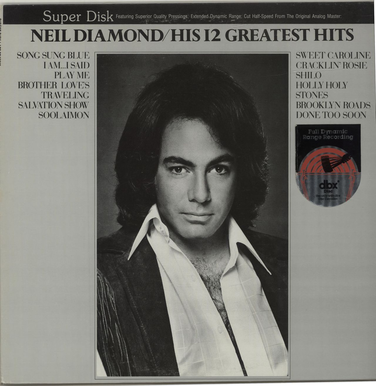 NEIL DIAMOND His 12 Greatest Hits (Limited Edition 1979 US audiophile issue of the 1974 12-track LP, half speed mastered & cut from the original analogue master. This disc is DBX encoded & fully compatible with regular stereo setups, praised for its crystal clear sound quality when used in conjunction with a DBX Disc Decoder, custom stickered picture sleeve with series insert. The sleeve shows some light edgewear & the vinyl is Excellent with few signs of play SD16612)