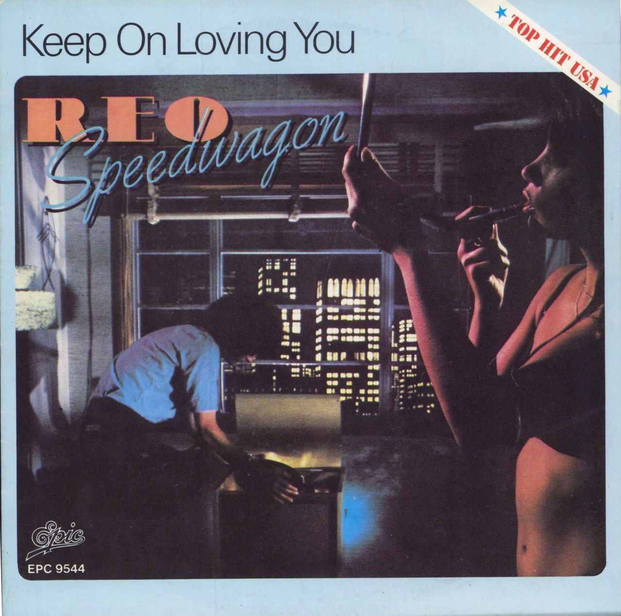 R.E.O. SPEEDWAGON Keep On Loving You (1981 Dutch wide-centred 7" vinyl single, also including Follow My Heart, paper picture sleeve variant with blue border and 'Top Hit USA' flash. The sleeve shows minimal wear and the vinyl looks barely played EPC9544)