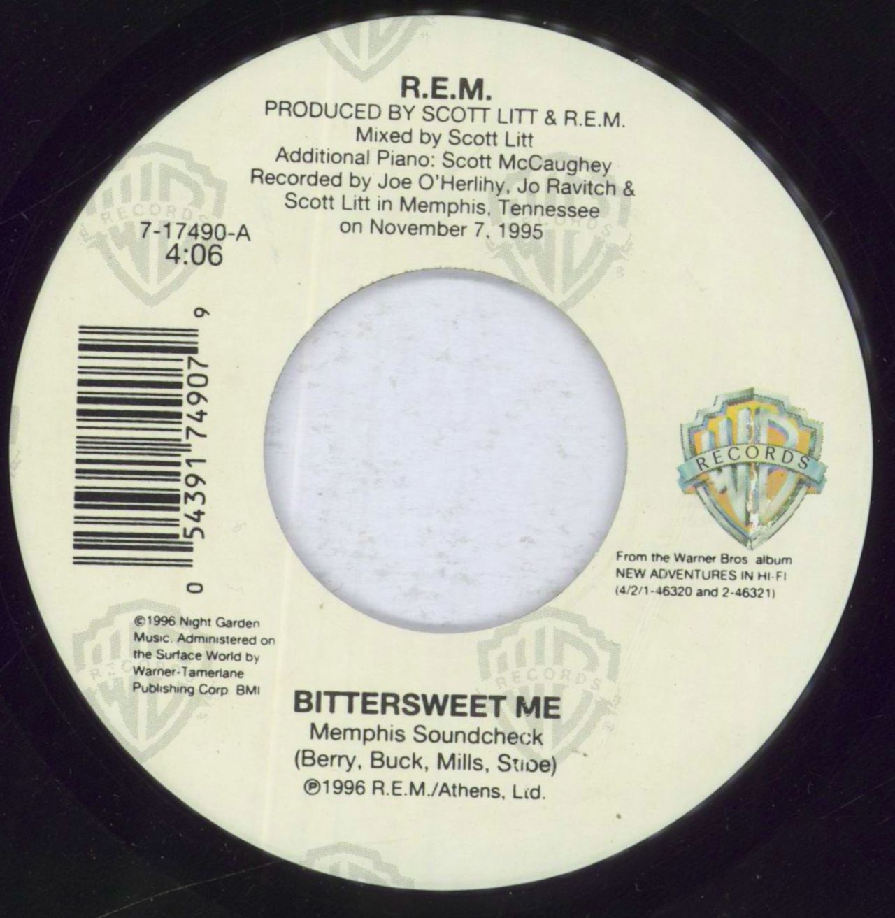 REM Bittersweet Me (1996 US wide centre 7" vinyl single, also with Undertow, barcoded labels and in a plain die-cut paper sleeve. The vinyl appears barely played)