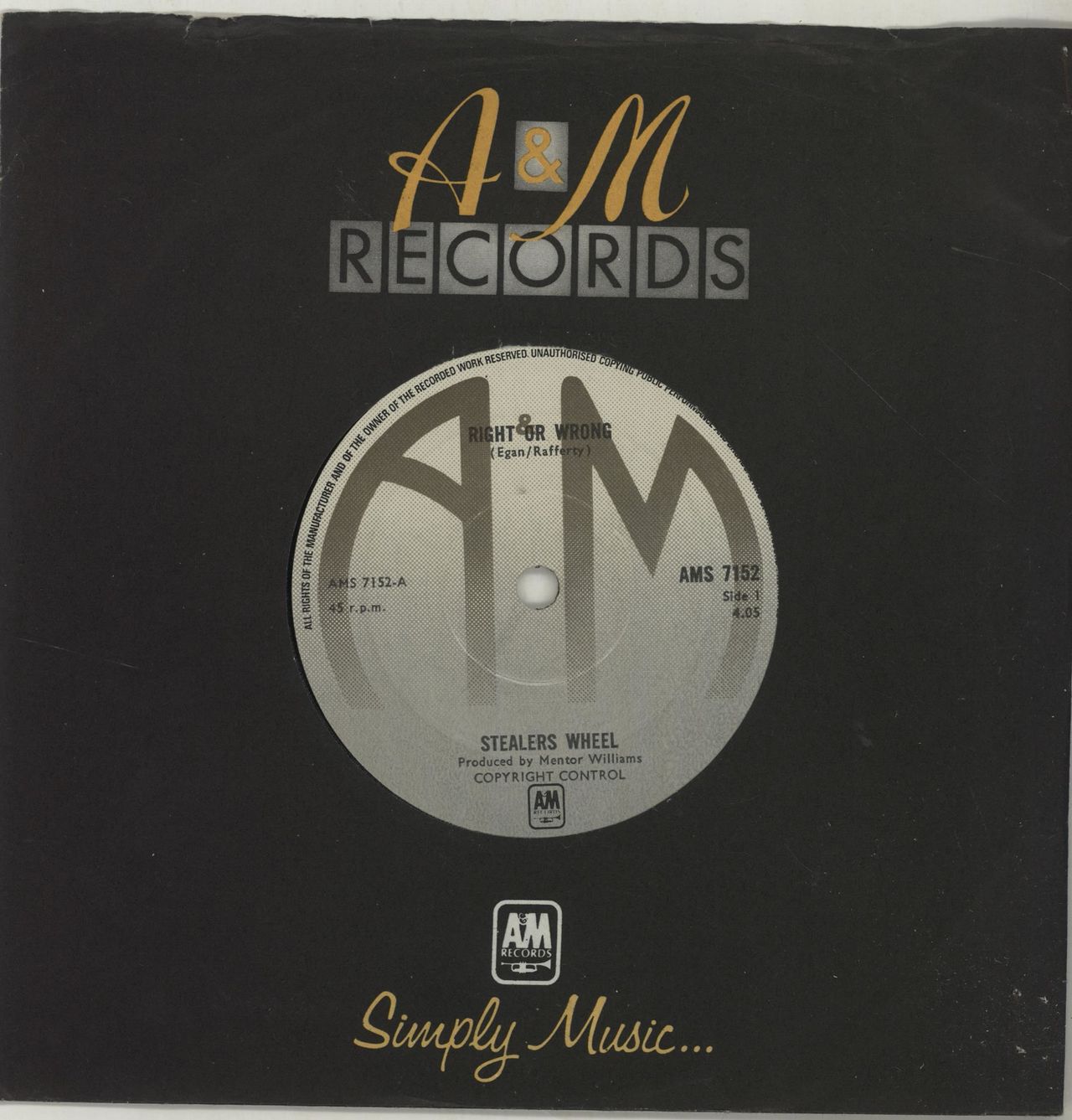 STEALERS WHEEL Right Or Wrong (1975 UK solid centre 7" vinyl single, also including This Morning, A&M company die-cut paper sleeve AMS7152)