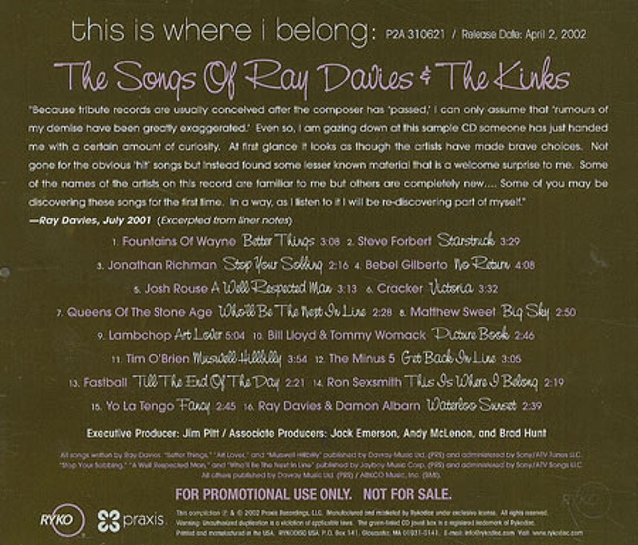 THE KINKS/VARIOUS This Is Where I Belong: The Songs Of Ray Davies & The Kinks (Scarce 2002 US 16-track advance promotional CD for the full tribute album includes 'Waterloo Sunset' by Ray Davies & Damon Albarn, 'Who'll Be The Next In Line' by Queens Of The Stone Age, 'Big Sky' by Matthew Sweet, 'Victoria' by Cracker and more. Custom pink printed disc complete with a title/tracklisting back insert P2A310621)