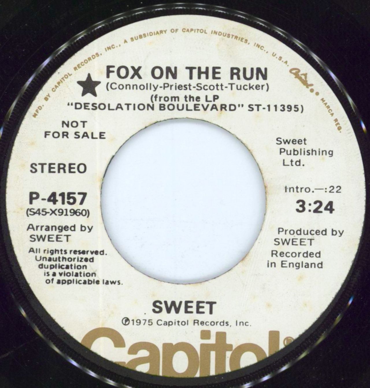 THE SWEET Fox On The Run (1975 US 7" promotional only wide-centred 7" vinyl single with both the mono and stereo versions, plain die-cut sleeve. The labels are free from writing and the vinyl is Excellent with little sign of play P-4157)