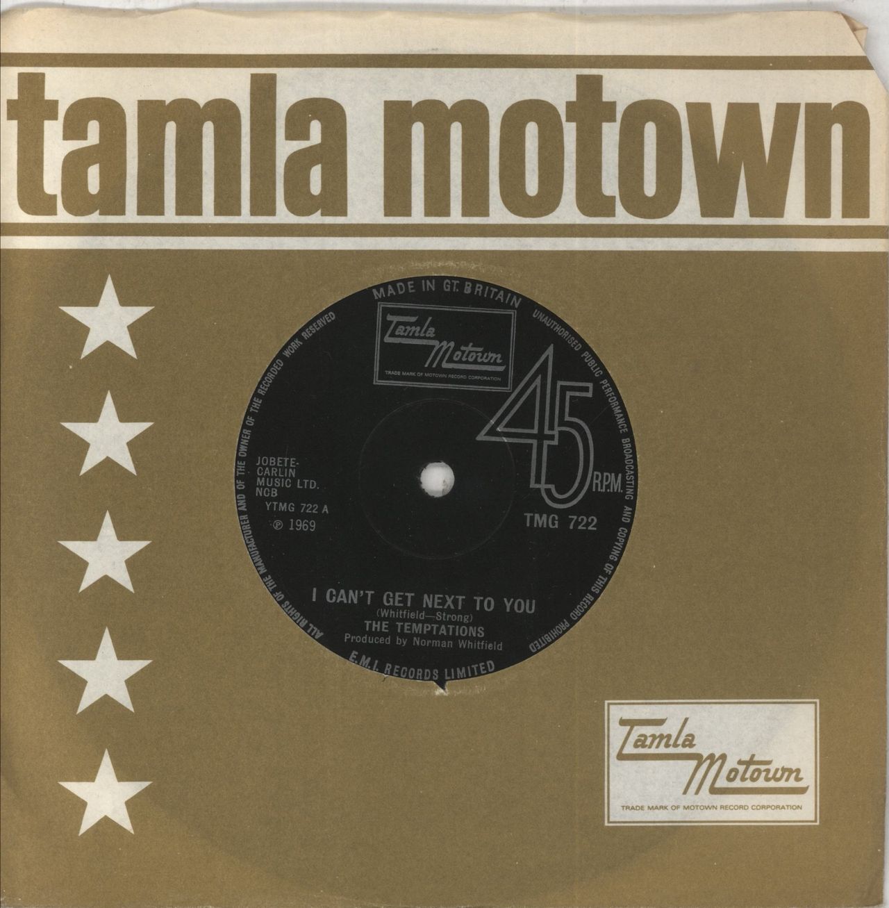 THE TEMPTATIONS I Can't Get Next To You (1969 UK solid centre 7" vinyl single, also including Running Away (Ain't Gonna Help You), both tracks co-written and produced by Norman Whitfield, Tamla Motown company die cut paper sleeve TMG722)