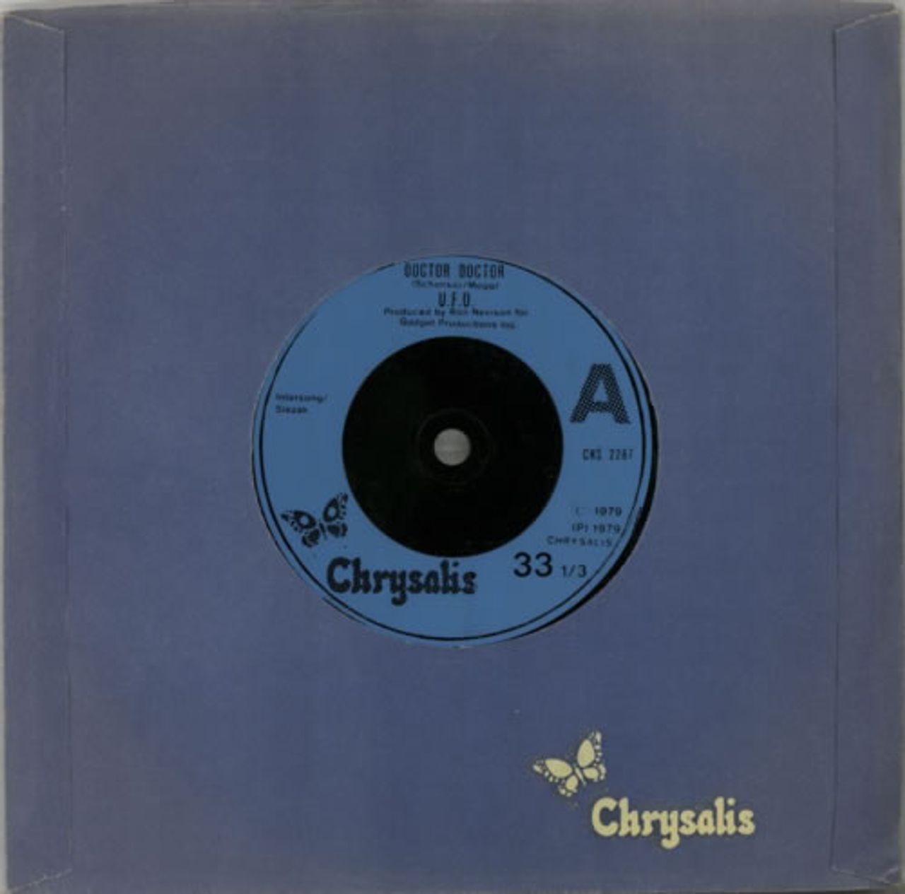 UFO Doctor Doctor EP (1979 UK 3-track injection moulded 7" vinyl EP playing at 33RPM, including a live version taken from the Strangers In The Night double album, adding a live version of On With The Action and Try Me, Chrysalis company die-cut paper sleeve CHS2287)