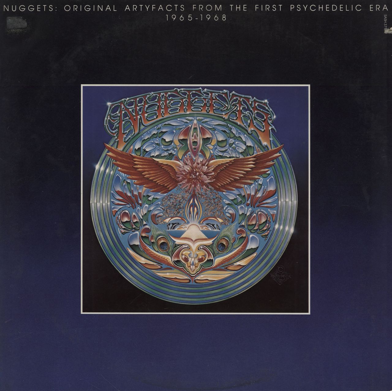 VARIOUS-PROG & PSYCH Nuggets: Original Artyfacts From The First Psychedelic Era (1976 US 27-track double LP, an alltime classic compilation put together by Lenny Kaye featuring a cast of one-offs whose scuzzed up R&B and psychedelia became a lodestone for the punk generation, housed in a gatefold picture sleeve variant with deletion saw cut in the opening edge plus illustrated inners. The sleeve is Excellent with a slight sticker mark in the top left corner and some light ringwear;one of the inners has a side seam split, whilst the vinyl shows few signs of play; remaining Excellent SASH3716-2)