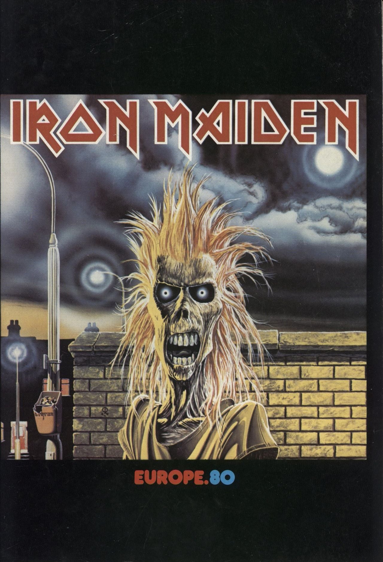IRON MAIDEN Europe 80 (Rare 1980 UK sixteen page tour programme listing the UK tour dates at the front, introduction written by Geoff Barton, pages dedicated to each of the original band members with biography text, intact full colour centrefold and merchandise page with information on the support act Praying Mantis and original album 'Eddie' artwork on the front. Apart from some light general storage wear this is in superb condition. This copy inludes a ticket stub for the 30th November show at the Apollo Theatre in Glasgow. A fantastic example)