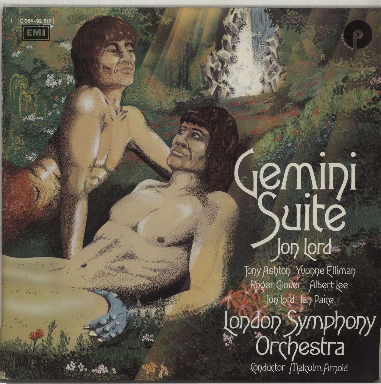 JON LORD Gemini Suite (1972 German 6-track stereo LP on the Purple label, housed in an eye-catching glossy gatefold picture sleeve. This album was commissioned by the BBC & performed by Deep Purple & the Light Music Society under Malcolm Arnold at the Royal Festival Hall in 1970, & Munichin '72 with Kammarorchestra conducted by Eberhard Schoener, also starring guitarist Albert Lee. The sleeve shows some light edge scuffing; the vinyl has just a couple of light surface scuffs and justalittle spindle wear to the labels. An excellent copy TPSA7501)