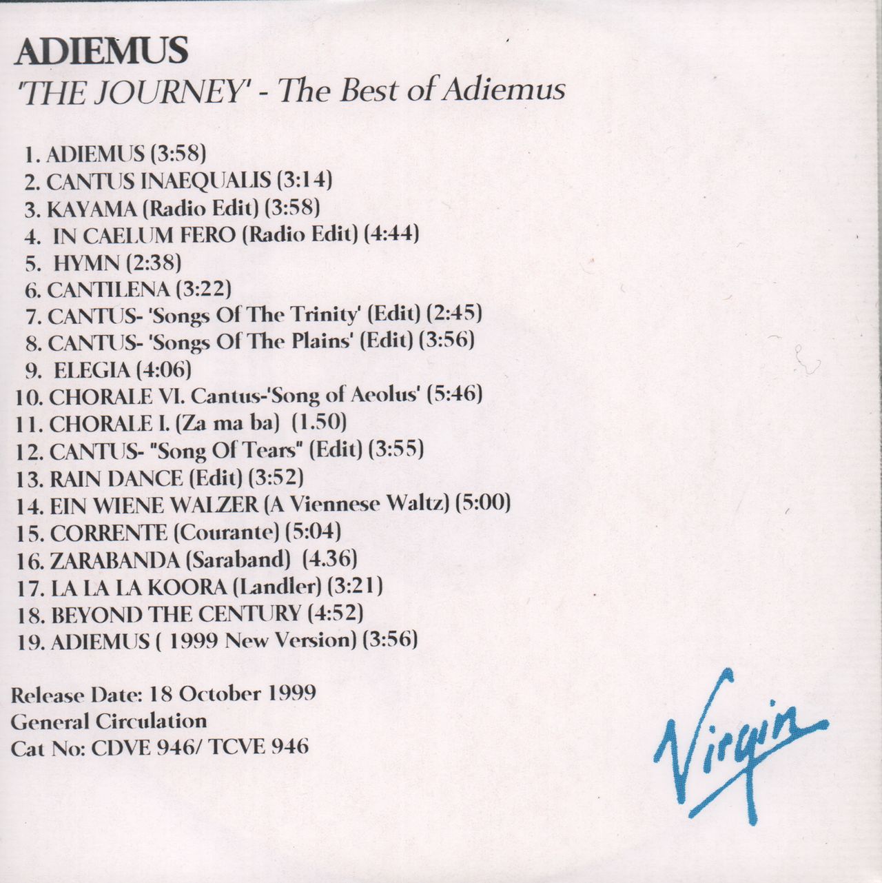 KARL JENKINS / ADIEMUS The Journey - The Best Of Adiemus (1999 UK 19-track advance promotional CD-R, custom printed disc with a tracklisting inlay)