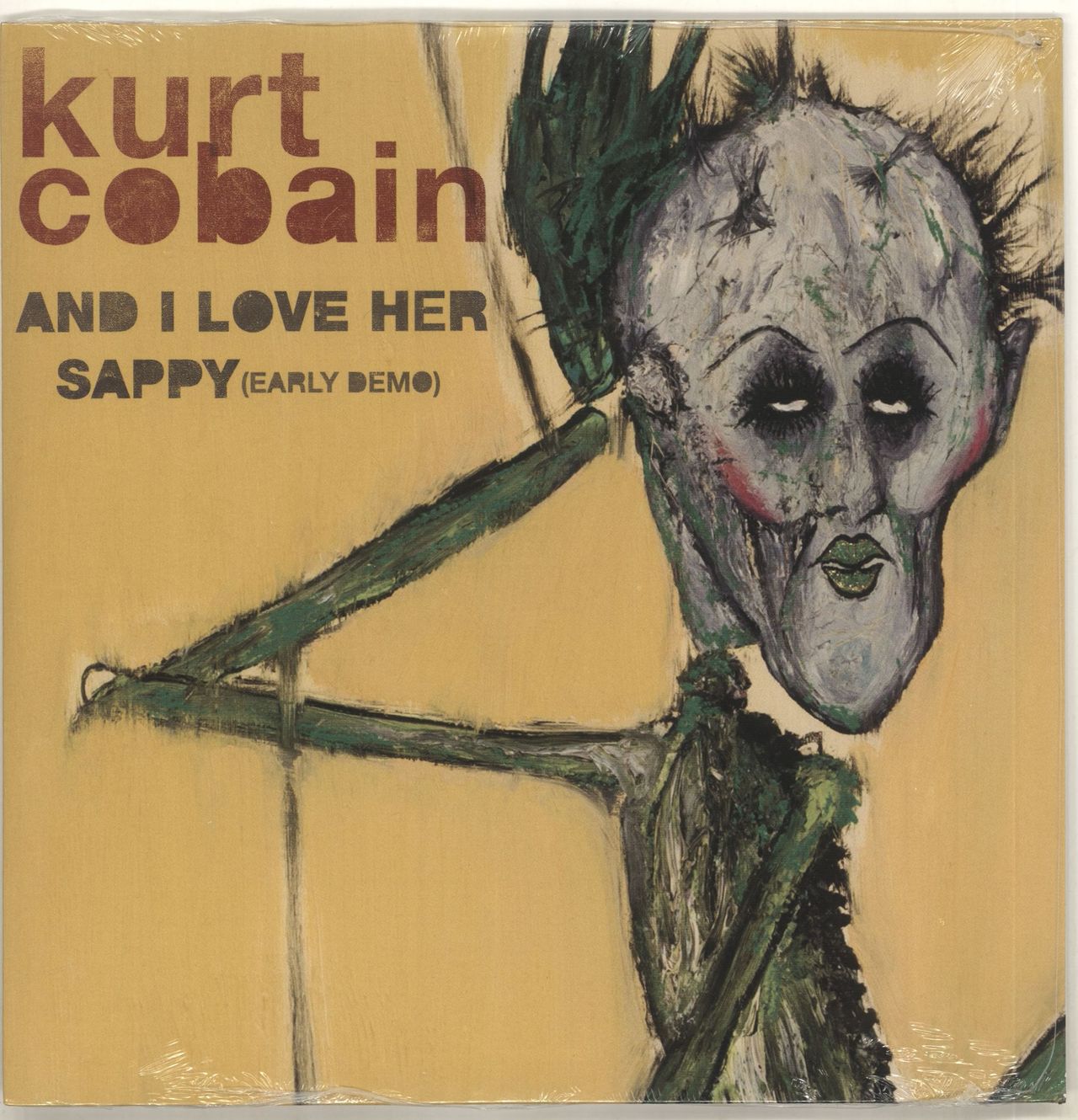 KURT COBAIN And I Love Her (Sealed 2015 US 7" vinyl single, featuring a then newly discovered recording of Kurt's cover of The Beatles song, as used in Kurt Cobain: Montage Of Heck. Also features an Early Demo of 'Sappy', housed in a deluxe picture sleeve sporting previously unseen artwork from the Cobain archives, sealed & unopened with a deletion mark through the barcode on the back cover)