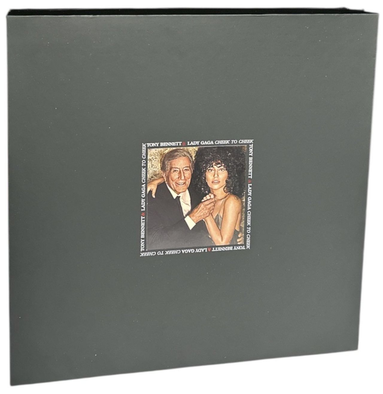 LADY GAGA & TONY BENNETT Cheek To Cheek (2014 US Limited Edition 4-disc Multi-Format Set containing the 15-track deluxe edition of the collaborative album from Tony Bennett and Lady Gaga, consisting of popular jazz standards by composers suchas George Gershwin, Cole Porter, Jerome Kern & Irving Berlin; a vinyl 7" featuring It Didn't Mean A Thing [If It Ain't Got That Swing] & Cheek To Cheek; the standard 11-track album pressed on vinyl LP; plus a DVD containing performances from their live tour.All four discs are individually sleeved and come complete with items of memorabilia such as sheet music, an embroidered handkerchief, personal snapshots, a selection of art prints, commemorative newspaper and more, all housed together inside a 13 x 13 x 3" black leather-finished box! Includes mailer box. The black leather-finished box has just a couple of light scuffs and minor wear to one of the corners. The contents are Near Mint to Excellent with minimal wear or evidence of play)
