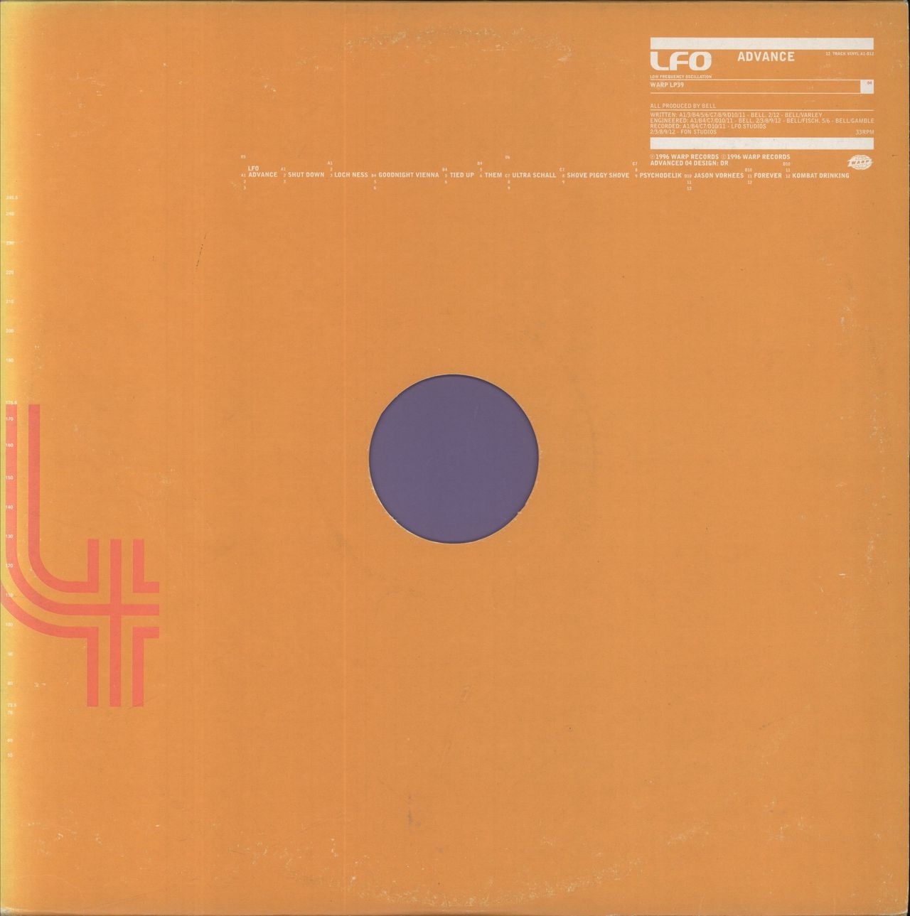 LFO Advance (1996 UK Warp Records 12-track double vinyl LP. Second album from the techno pioneers from Leeds. Housed in a single pocket orange die-cut picture sleeve and mauve/silver inners. The sleeve has some minor ringwear/edgewear and a little fading around the edges, but remain in Excellent condition and the vinyl show the odd very faint inaudible hairline and light signs of play. WARPLP39)