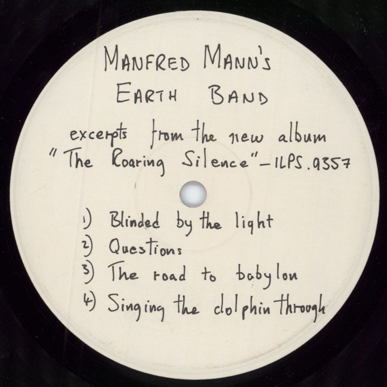 MANFRED MANN'S EARTHBAND Excerpts From 'The Roaring Silence' (1976 UK 4-track one-sided white label Test Pressing sampler for the album featuring Blinded By The light, Questions, The Road To Babylon & Singing The Dolphin Through, custom hand written label. The vinyl has a few light scuffs leaving it VG+ MM1)