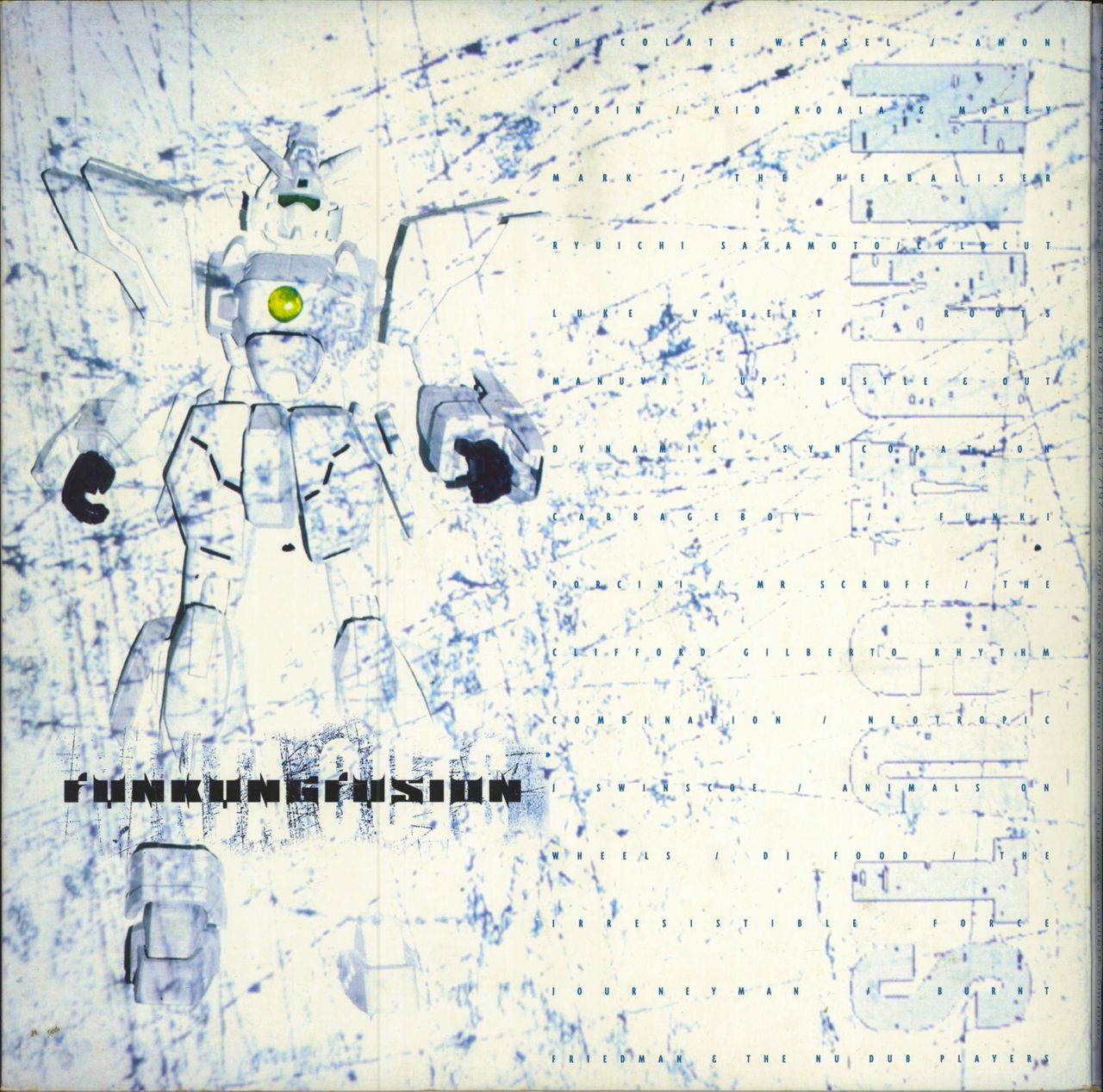 VARIOUS Ninja Cuts: Funkungfusion (1998 UK 21-track triple LP gathering some of the best tunes from the label [& sublabels N-Tone & Big Dada] back when Ninja Tune was at its peak, with Amon Tobin, Luke Vibert, Ryuichi Sakamoto, Kid Koala, Mr Scruff, Funki Porcini, The Irresistible Force, DJ Food, The Herbaliser & more. Comes housed in a deluxe wide spined gatefold pocket sleeve complete with illustrated inners, flyer insert & the CD-sized 'The Bluffers Guide To Ninja Tune' booklet. The sleeve is Excellent with minor shelf wear, the vinyl grades EX/EX- with some light paper hairlines not upsetting play ZEN33)