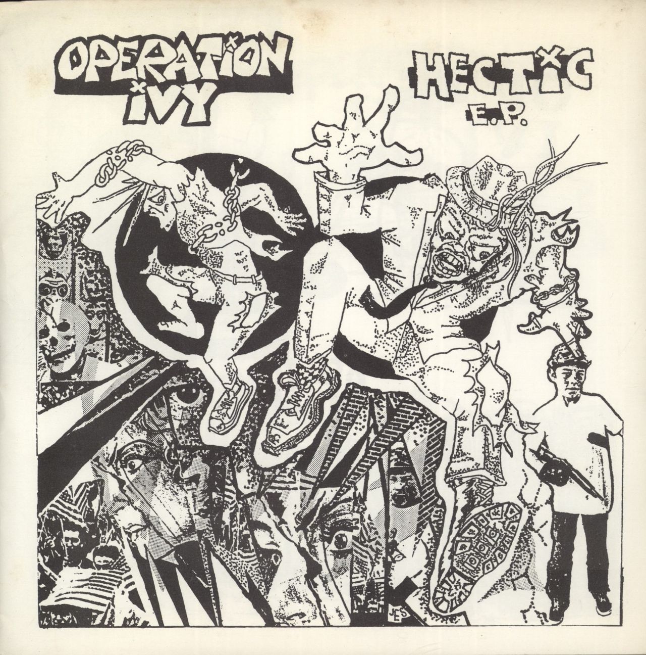 OPERATION IVY Hectic E.P. (Late 80s/Early 90s US 6-track 7" vinyl EP, featuring Junkie's Runnin' Dry, Here We Go Again, Hoboken, Yellin' In My Ear, Sleep Long and Healthy Body, glossy picture sleeve with 8-page illustrated lyric booklet. The sleeve and booklet shows just a little light foxing from age. The vinyl reveals minimal signs of play #3)