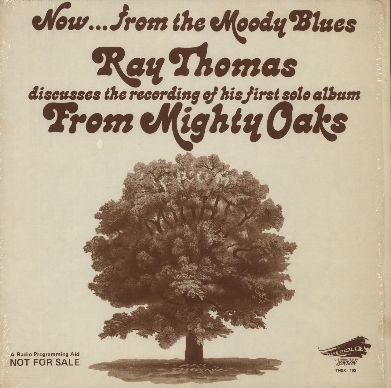 RAY THOMAS Now...From The Moody Blues Ray Thomas Discusses The Recording Of His First Solo Album From Mighty Oaks (1975 US promotional only 22-track vinyl LP intended for radio broadcast, picture sleeve with cue sheet. The sleeve is in its opened shrinkwrap and the vinyl appears barely played THSX-102)