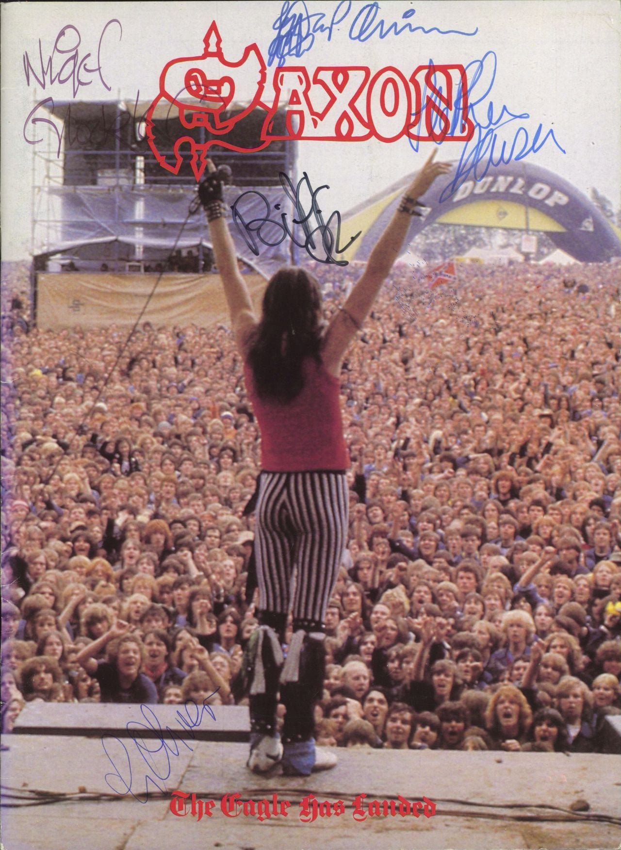 SAXON The Eagle Has Landed (Fully Autographed Official 1982 UK 20 page 13" x 9½" concert programme featuring lots of 'live' photographs and information, with text by Brian Harrigan, also has two pages for the support act Cheetah. This example remains in a fantastic condition, with light wear & signs of age, and has been signed by Biff Byford, Graham Oliver, Nigel Glockler, Steve Dawson and Paul Quinn in a blue or black marker pen across the front. Looks fantastic andideal for framing!)