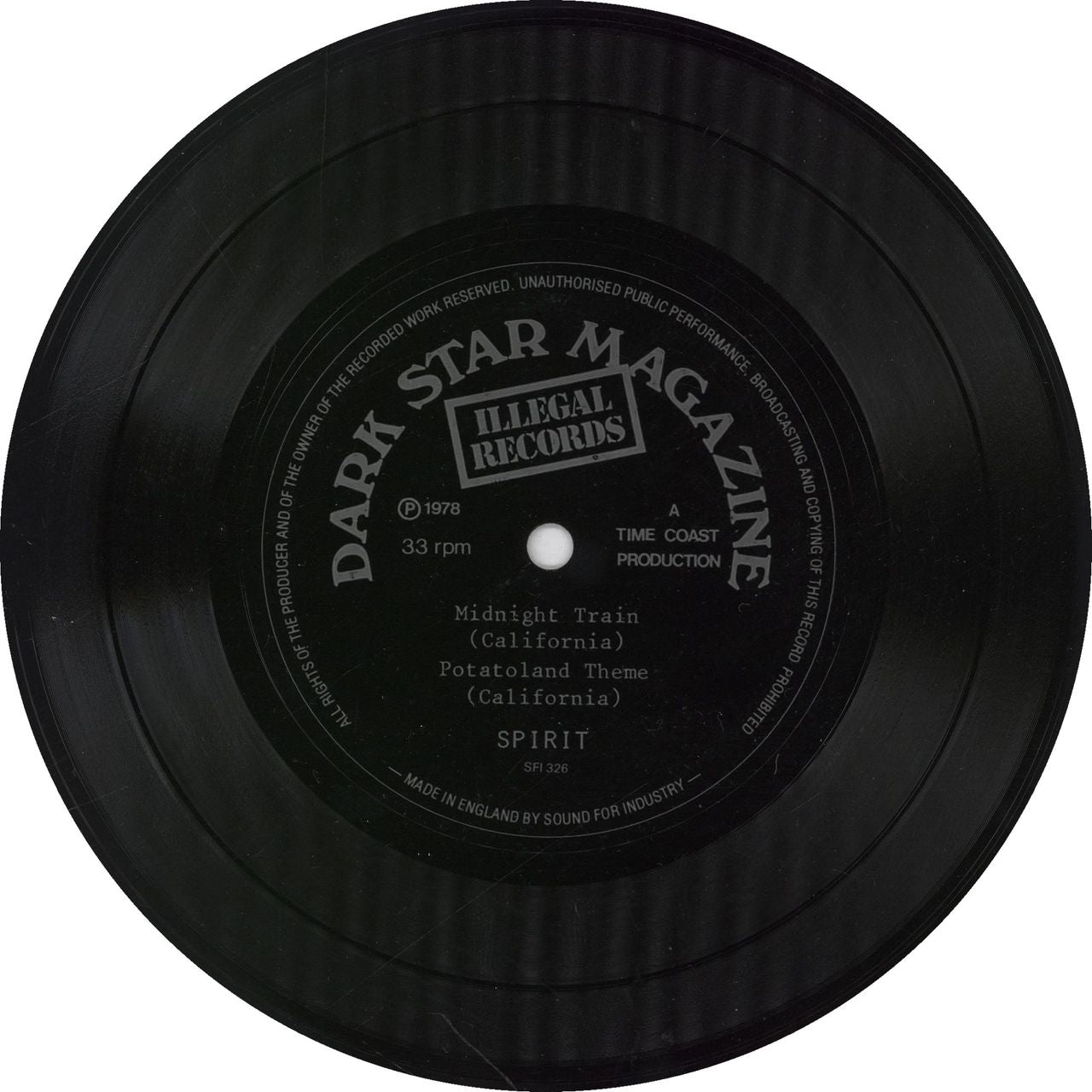 SPIRIT Midnight Train (1978 UK single-sided 7" vinyl flexidisc, also featuring the Potatoland Theme, originally given away free with Dark Star Magazine, plain die-cut sleeve SFI326)