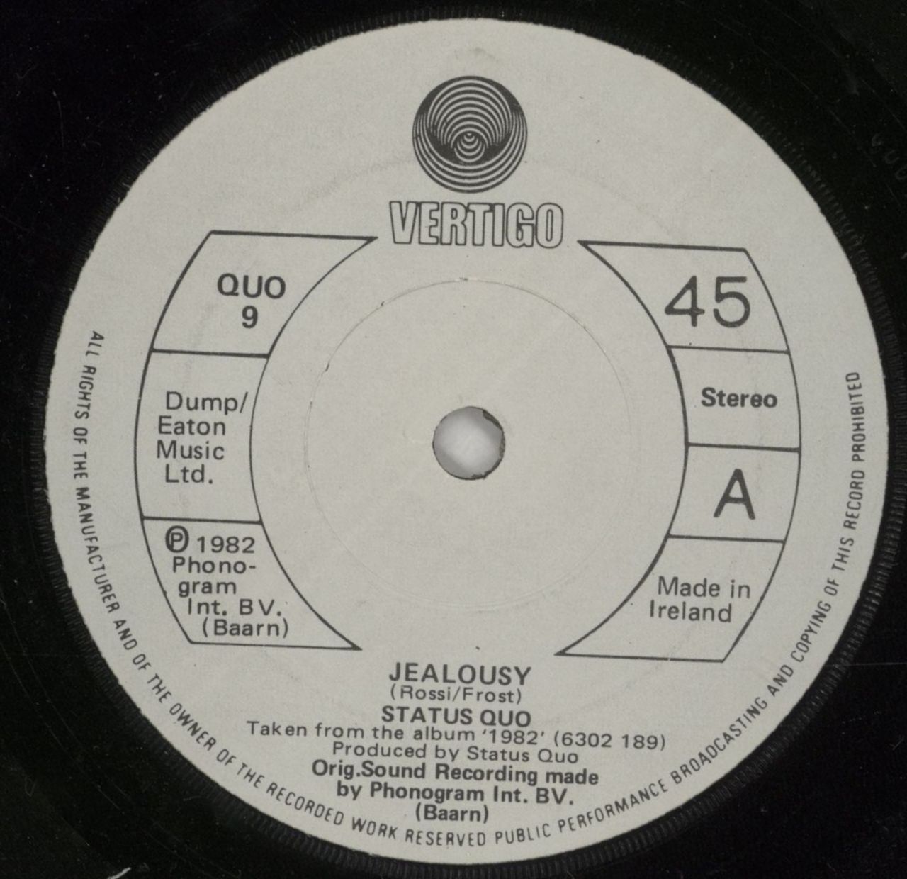STATUS QUO Jealousy (Rare withdrawn 1982 Irish only solid centre vinyl 7" single, also including Calling The Shots, housed in a plain die-cut paper sleeve. Apart from being released in Germany with a different B-Side, this single was relased only in Ireland, and was cancelled at the last minute. This example remains in a really nice condition with clean labels and minimal signs of play, the first copy we have ever seen, and the only single releases with the unique 'QUO9' catalogue number!)