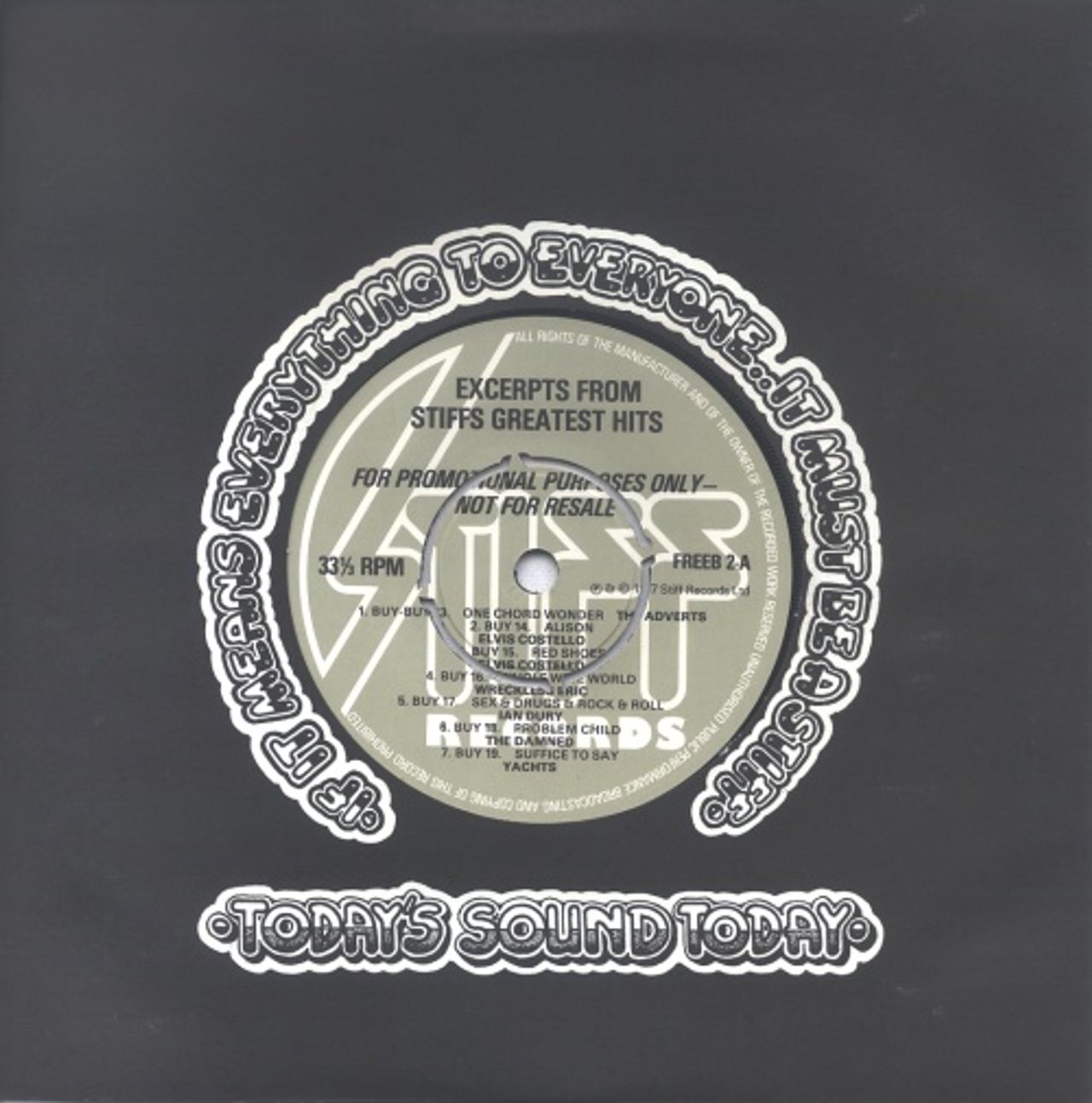 STIFF RECORDS Excerpts From Stiffs Greatest Hits (Rare 1977 UK promotional-only 33rpm vinyl 7" featuring snippets from each of the second twelve singles issued by the company [BUY13 to BUY24], including excerpts of tracks by The Adverts, ElvisCostello, Wreckless Eric, Ian Dury, The Damned [Problem Child & Don't Cry Wolf], Yachts, Nick Lowe & Larry Wallis, all linked by a crazy DJ voiceover, Stiff company die-cut paper sleeve. Obtained from a former Stiff Records employee, this example is in Mint condition FREEB2)