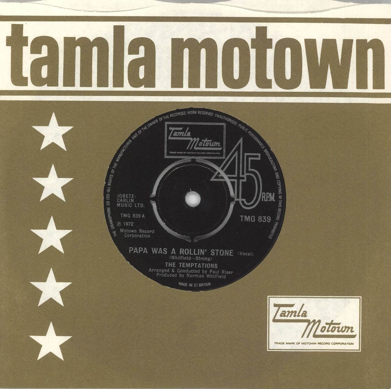 THE TEMPTATIONS Papa Was A Rollin' Stone (1973 UK 7" vinyl single with intact four prong centre, including both the Vocal & Instrumental Versions, Tamla Motown company die-cut sleeve. The sleeve shows a little light foxing whilst the vinyl appears barely played TMG839)