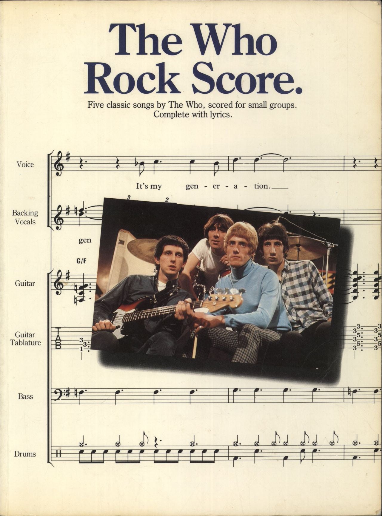 THE WHO The Who Rock Score (Rare 1989 UK 80-page softback songbook featuring five classic songs - arranged for full score - all guitars, bass, drums and vocals! The cover shows obvious creasing with some pen marks to inside front cover whilstall pages are legible with no tears/rips etc AM77793)