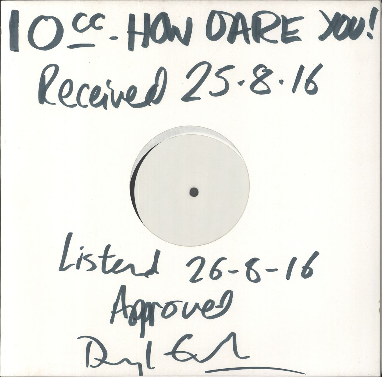 10CC How Dare You! (One-Off Test Pressing for the 2016 UK/EU audiophile issue of the 1975 9-track LP on Heavyweight Vinyl, with plain white labels & matrix detail etched by hand in the run-outs. Comes housed in a plain die-cut card sleeve with the artist & album title annotation & engineer approval. The vinyl is near 'as new' - Only a small select handful of these would have been produced, purely to test the sonics & never to be sold to the general public this way. A superbex-industry find)