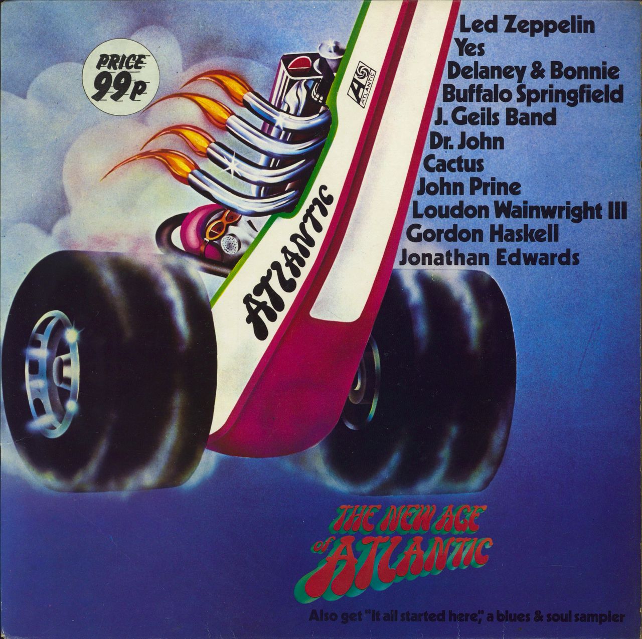 VARIOUS The New Age Of Atlantic (1972 UK 11-track stereo vinyl compilation LP label sampler including the rare Led Zeppelin track 'Hey Hey What Can I Do' plus a blistering 10 min + version of Simon And Garfunkel's America by Yes, plus tracksby Loudon Wainwright III and Buffalo Springfield amongst others, picture sleeve with the original 'price 99p' sticker.The sleeve shows a crease to the left had corner and general edge/shelfwear whilst the vinyl remains in excellent condition with little evidence of play K20024)