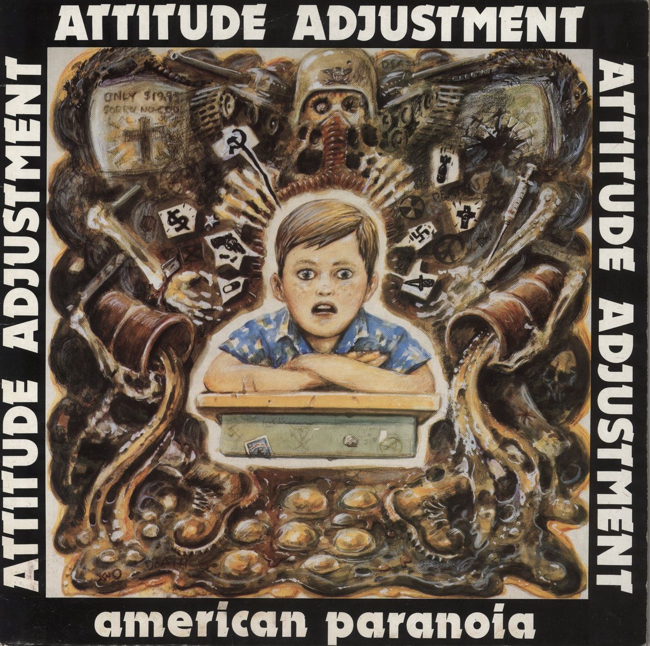 ATTITUDE ADJUSTMENT American Paranoia (1986 US 16-track vinyl LP. Debut full length studio album from the punk-thrash cross over band from the San Francisco Bay Area. Picture sleeve. The sleeve shows some edgewear and a little discolouration. The vinyl is Excellent with just a few small faint cosmetic scuffs and light signs of play. PUSMORT0012-11)