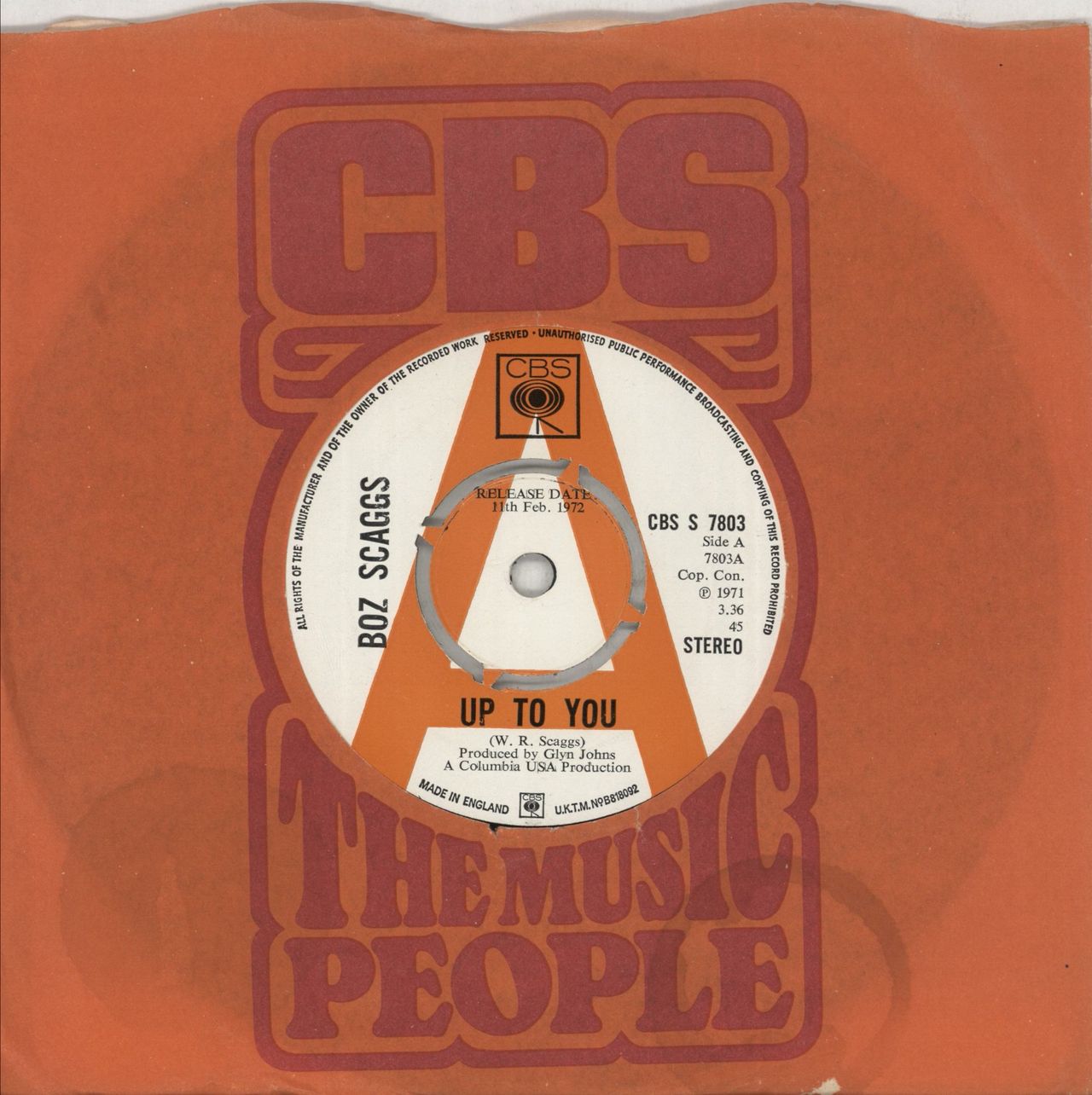 BOZ SCAGGS Up To You (1972 UK 'A' Label promotional four-prong centre 7" vinyl single backed with Runnin' Blue. Housed in a CBS company die cut sleeve. The vinyl displays one or two very faint cosmetic scuffs which cannot be felt to the touchand would not have any real impact on play CBSS7803)