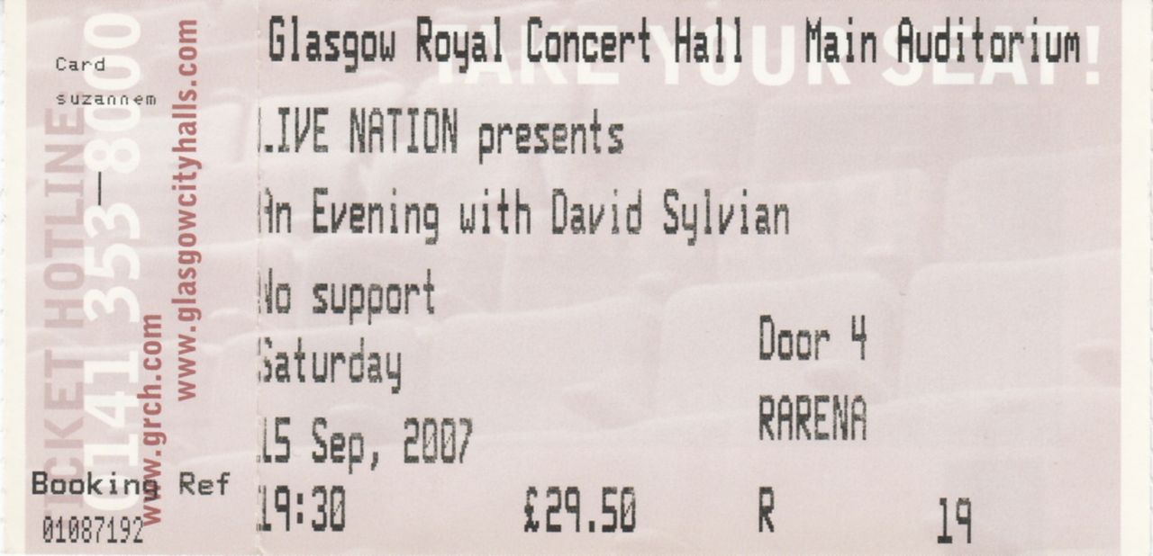 DAVID SYLVIAN An Evening With David Sylvian (An original ticket for the 15th September 2007 show at the Glasgow Royal Concert Hall, ideal for any fan who was at the show!)