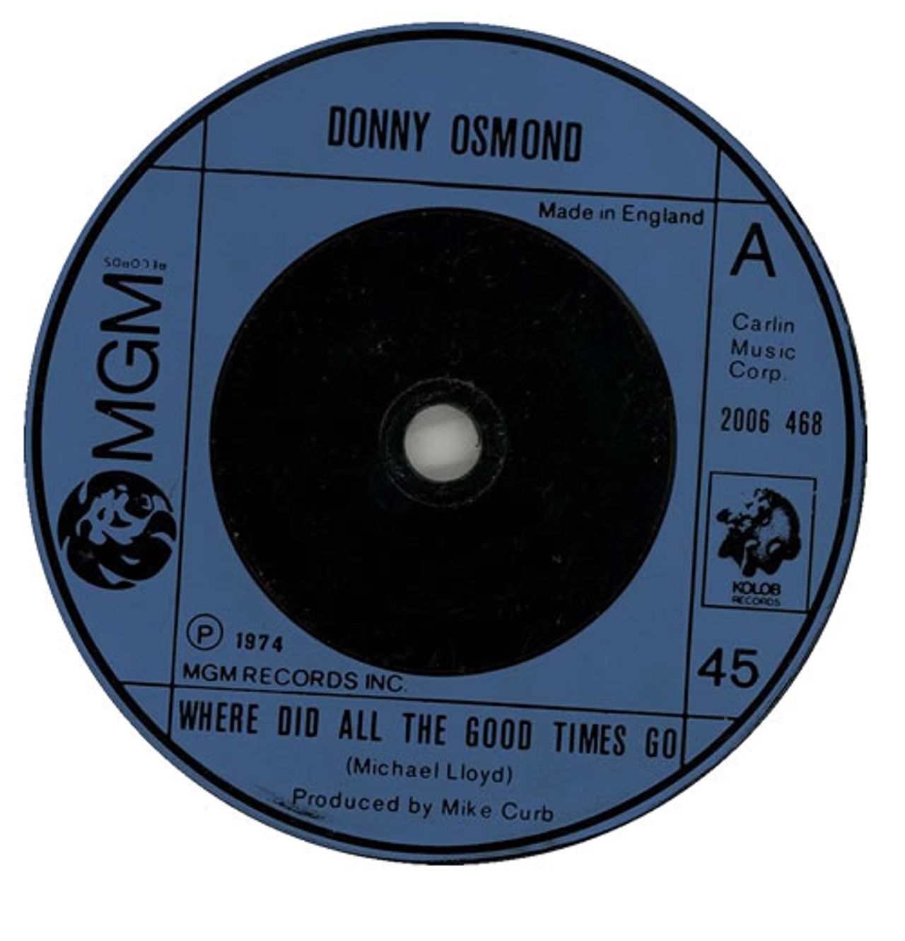 DONNY OSMOND Where Did All The Good Times Go (1974 UK injection moulded 7" vinyl single, also including I'm Dyin', die cut paper sleeve)
