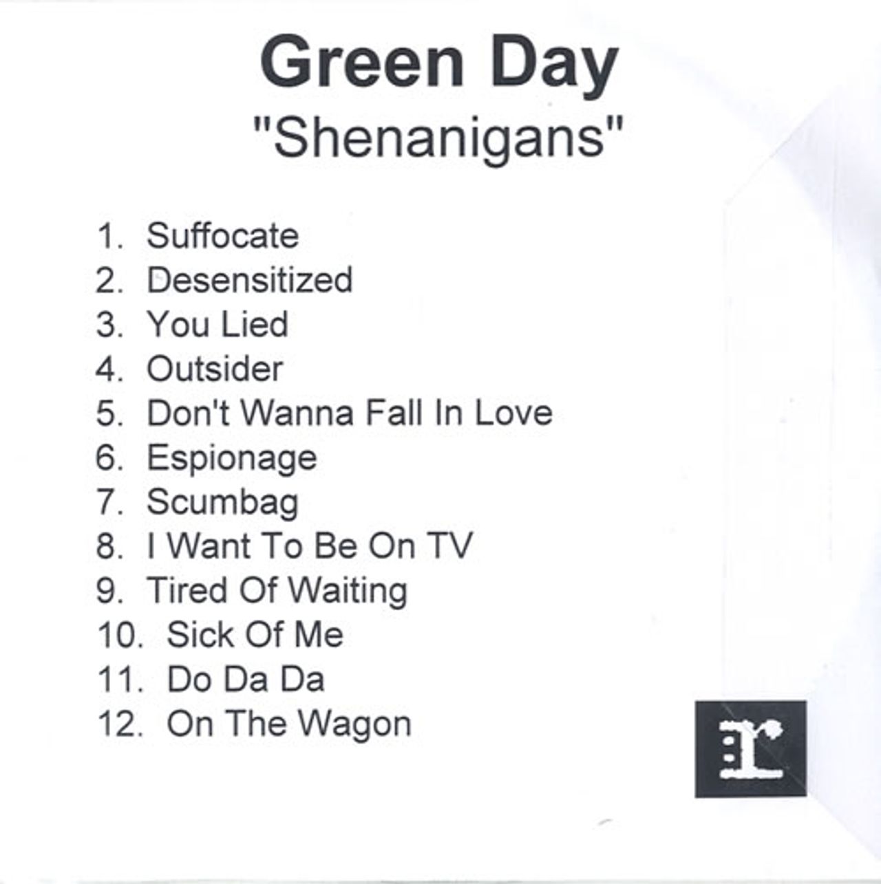 GREEN DAY Shenanigans (Official 2002 UK Reprise 12-track promotional advance CD-R for the album of rarities and B-sides recorded between 1994 and 2001 - an all-out upbeat punk-fest like only Green Day know how. Custom printed disc and title/tracklisting inlay)