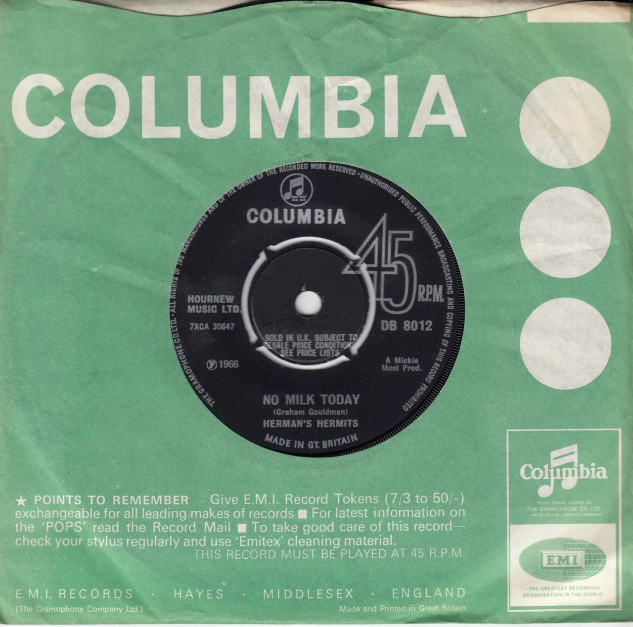 HERMAN'S HERMITS No Milk Today (1966 UK 7" vinyl single with intact four prong centre, also including My Reservation's Been Confirmed. The vinyl has evidence of spindle wear to the labels but remains in EX condition issued in the Columbia company die-cut paper sleeve DB8012)