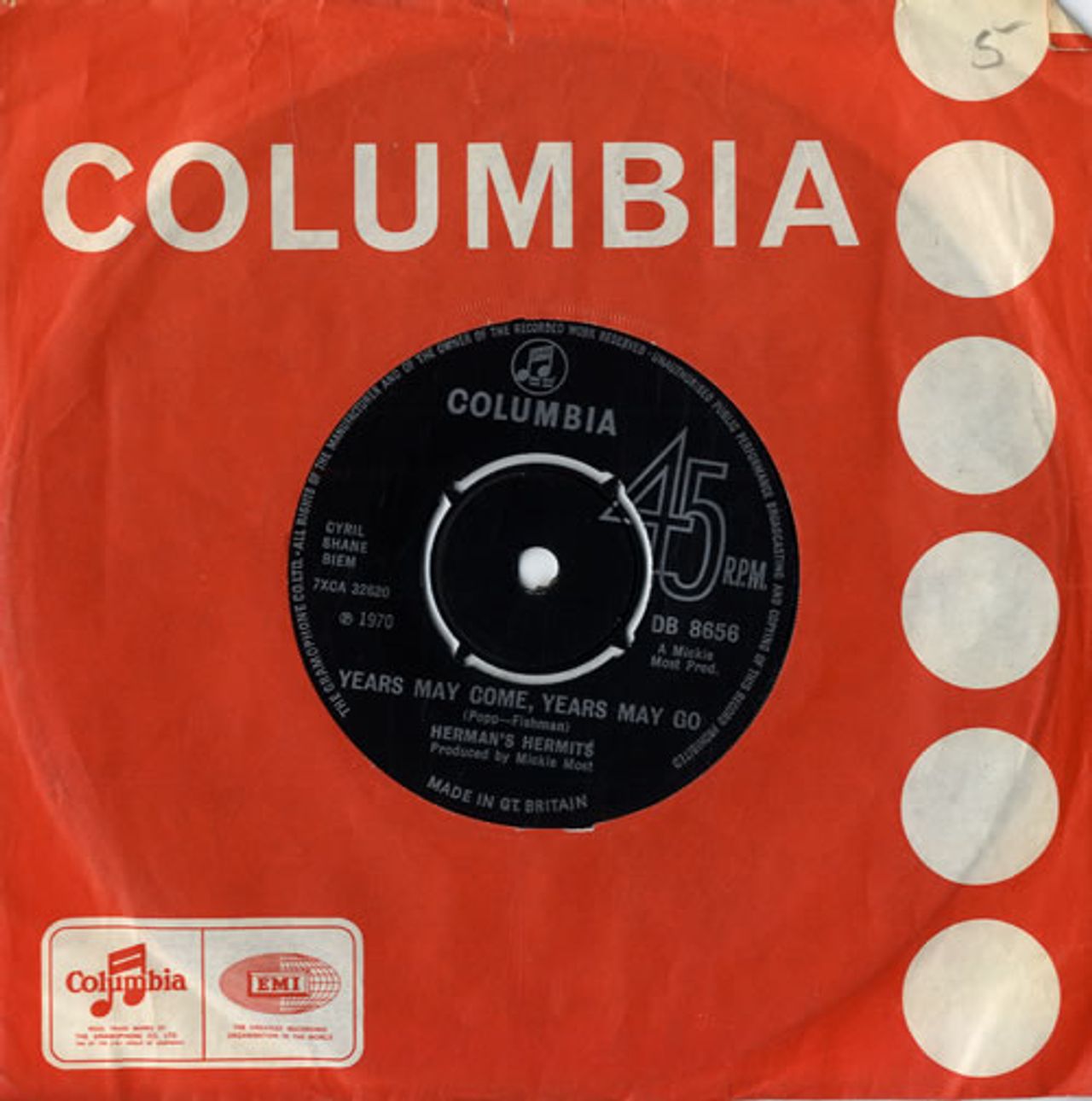 HERMAN'S HERMITS Years May Come, Years May Go (1970 UK 7" vinyl single with intact four prong centre, also including Smile Please, record company die cut paper sleeve DB8656)