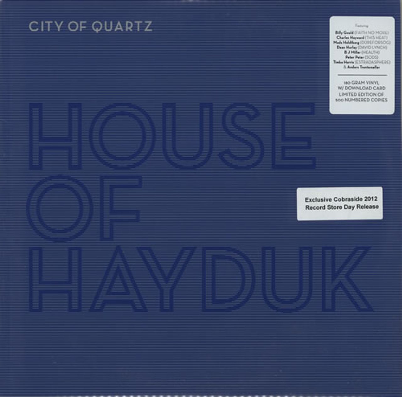 HOUSE OF HAYDUK City Of Quartz (Limited edition 2012 US 4-track debut LP pressed on 180gram Vinyl, an exclusive Cobraside 2012 Record Store Day release. The House Of Hayduk project was devised by Danish producer & film composer Mads Heldtberg, signed to Billy Gould’s label Koolarrow. Features Billy Gould (Faith No More), Charles Hayward (This Heat), Dean Hurley (David Lynch's group), B J Miller (Health), Peter Peter (Sods), Timba Harris (Estradasphere) & Anders Trentemøller, housed in a numbered custom stickered sleeve with album credit insert & bonus download code for the album FDRLP021)