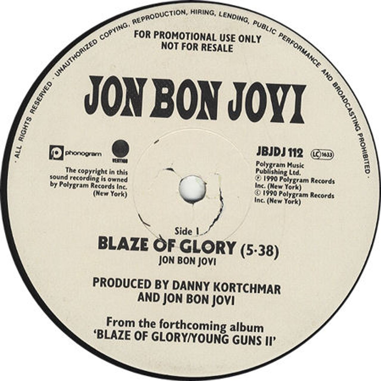 JON BON JOVI Blaze Of Glory (1990 UK white title label DJ promotional vinyl 12", playing the same 5:38 version on both sides, plain die-cut sleeve JBJDJ112)