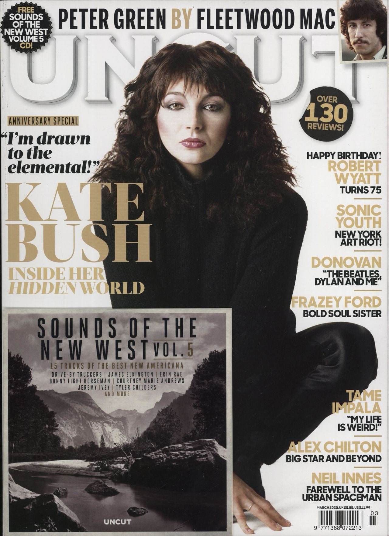 KATE BUSH Uncut (March 2020 UK 120-page music magazine featuring a 12-page fully illustrated article on Kate Bush - forty-five years after her first professtional recordings at AIR studios. Peter Watts digs deep into Kate's early years to unearth the roots of her enduring, incandescent power - from the fringes of Kent to the wild Yorkshire Moors and beyond. Also includes edited highlights of an interview made by Uncut's Andy Gill with Kate in 2011, plus wonderful cover shot. The magazine also contains articles on Fleetwood Mac, Robert Wyatt, Sonic Youth, Donovan, Alex Chilton and more, plus a 15-track 'Sounds Of The New West Vol. 5' cover CD featuring the best of new Americana)