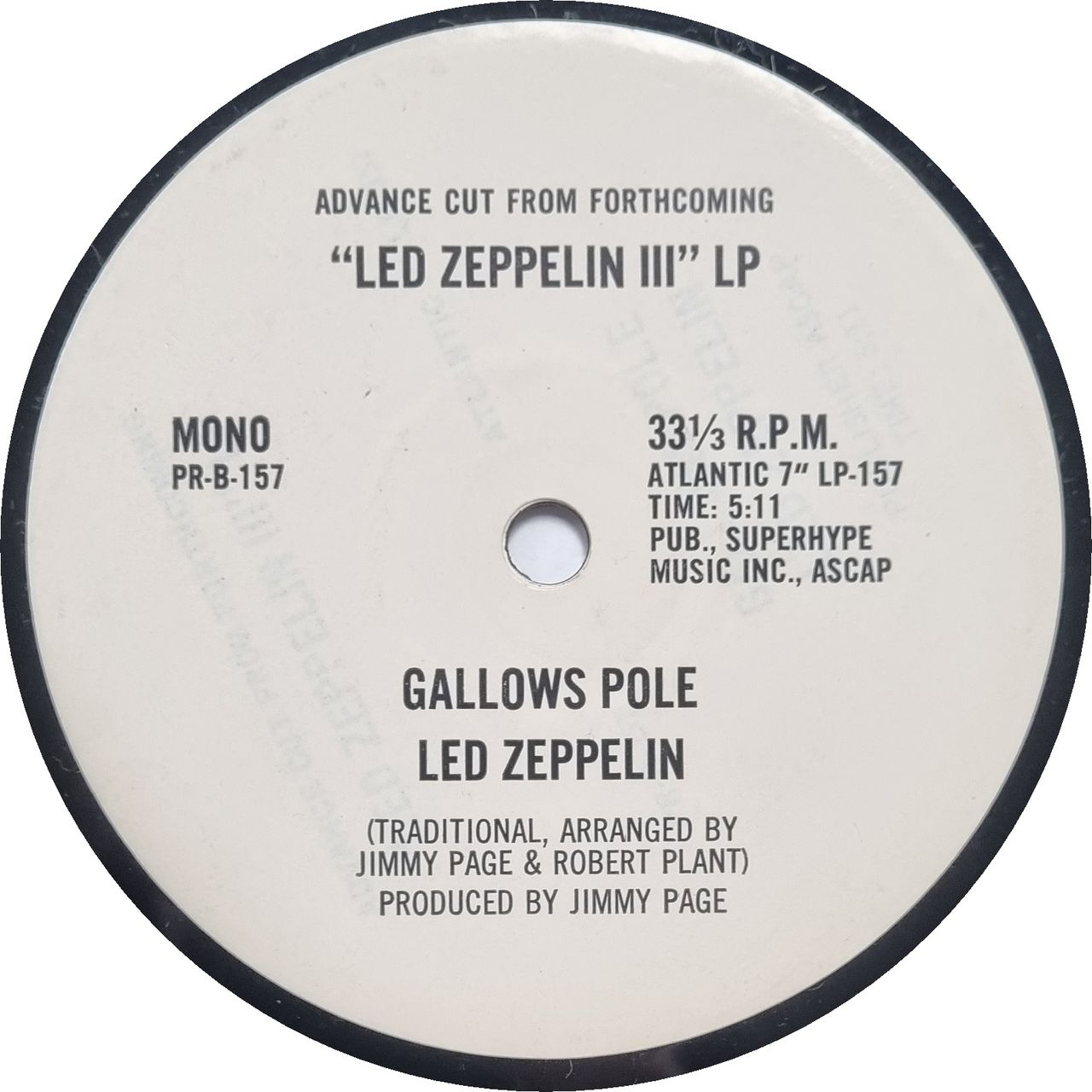 LED ZEPPELIN Gallows Pole (Extremely rare 1970 US advance promotional solid centre vinyl 7" with custom pasted over 'Advance cut from forthcoming "Led Zeppelin III" LP' black on white labels with credits listed, this was issued to radio stations before the release of the album and plays the Mono and Stereo versions, housed in a plain card sleeve. The version of the song features is approximately eleven seconds longer to that used on the album, making this unique to this release. Both sides of the vinyl have a few surface marks. The Mono side plays Excellent with very little lessening in sound quality, whilst the Stereo side is Very Good with a few clicks during playback but plays without any issues. A stunning rarity and the first we have ever seen ST-PR-A-157)